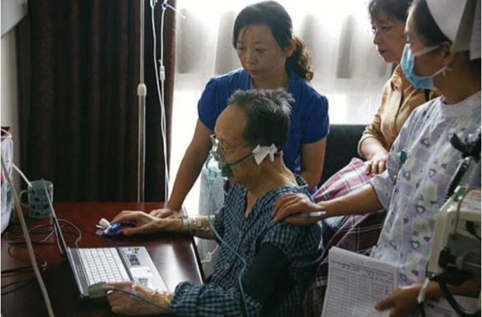 身上插着4根管子、头戴氧气罩的林俊德却依旧手握鼠标工作。